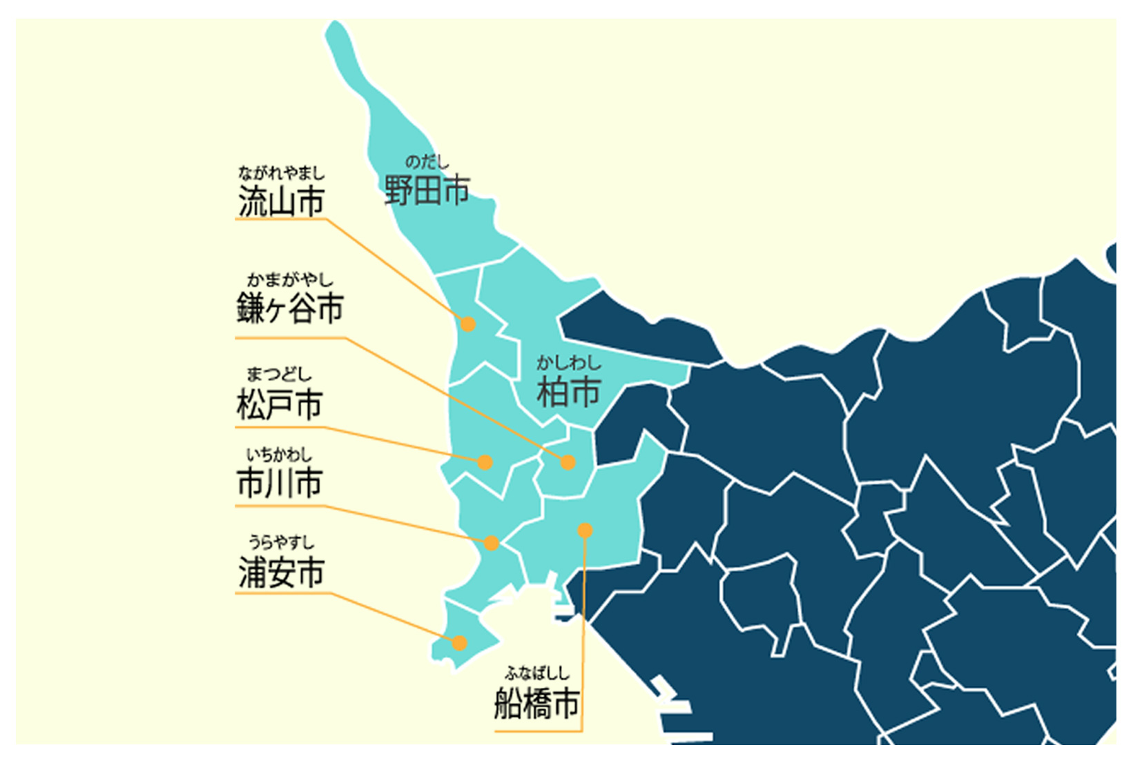 野田市、流山市、松戸市、市川市、浦安市、船橋市、柏市、鎌ケ谷市