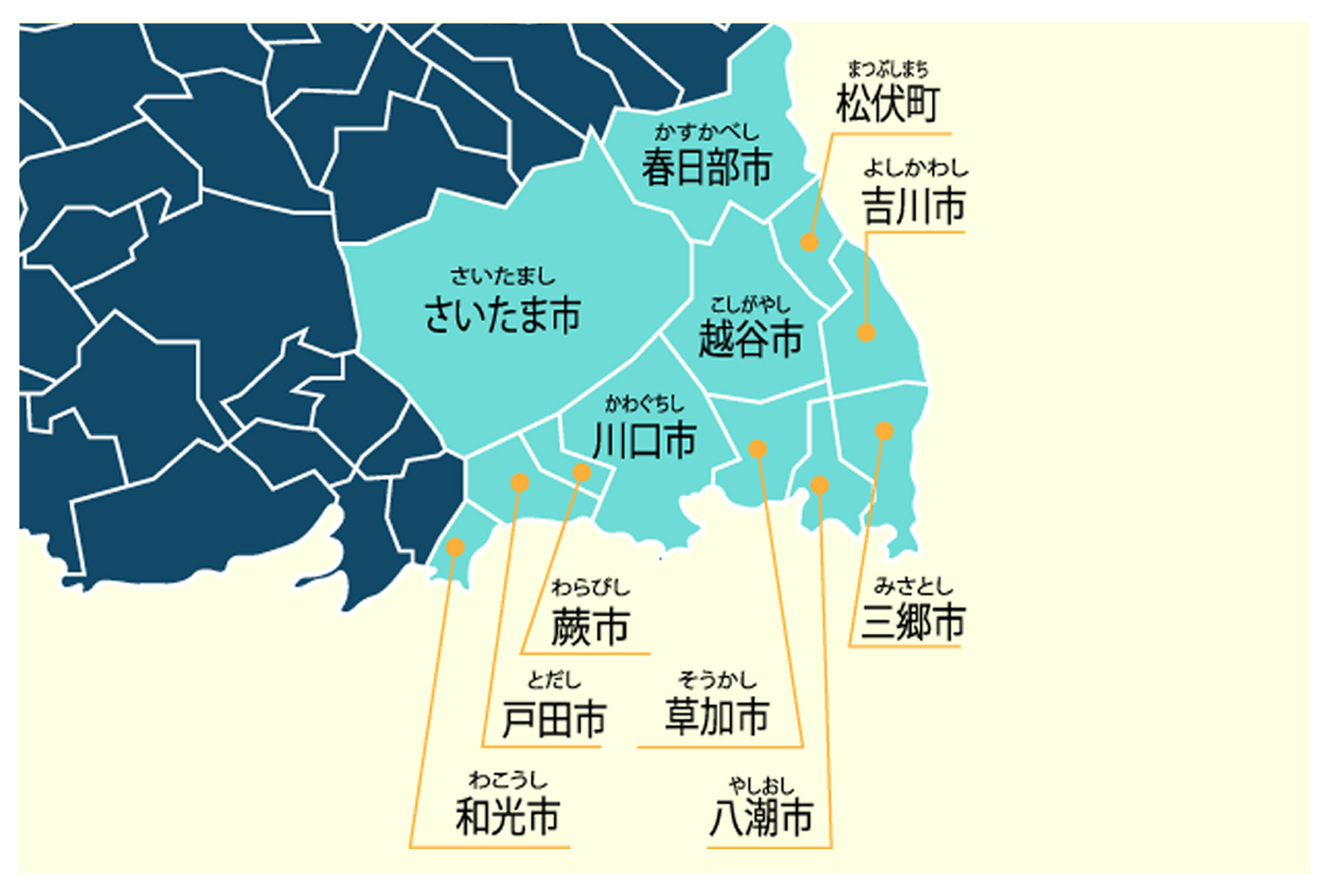草加市、八潮市、三郷市、川口市、さいたま市、戸田市、蕨市、和光市、春日部市、越谷市、吉川市、松伏町